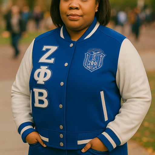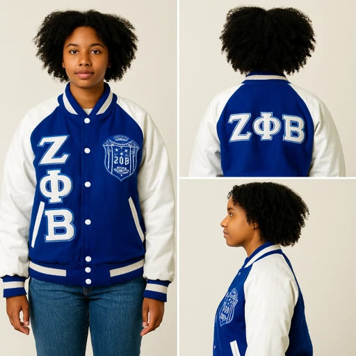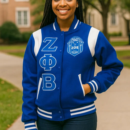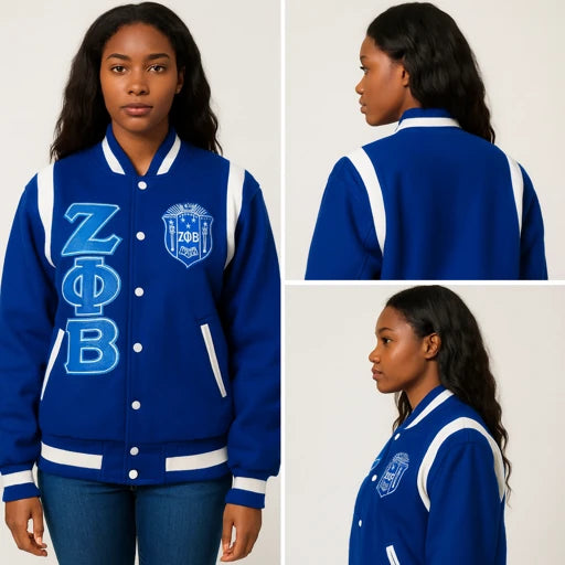Celebrate Finer Womanhood with this Custom Zeta Phi Beta Varsity Jacket, handcrafted in premium royal blue wool with optional white leather sleeves. Each jacket is made to order and fully personalized with your name, line number, crossing year, chapter, shield, dove, Greek letters, and more.