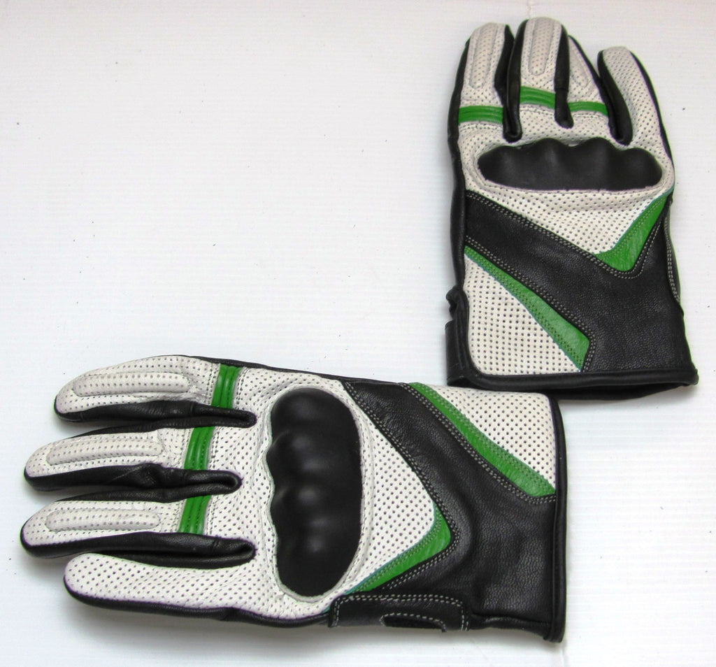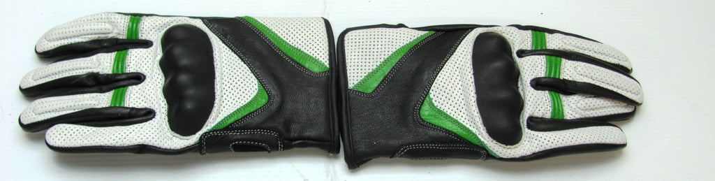Leather Motorcycle Gloves with Armour Guard on Knuckles White Black Green