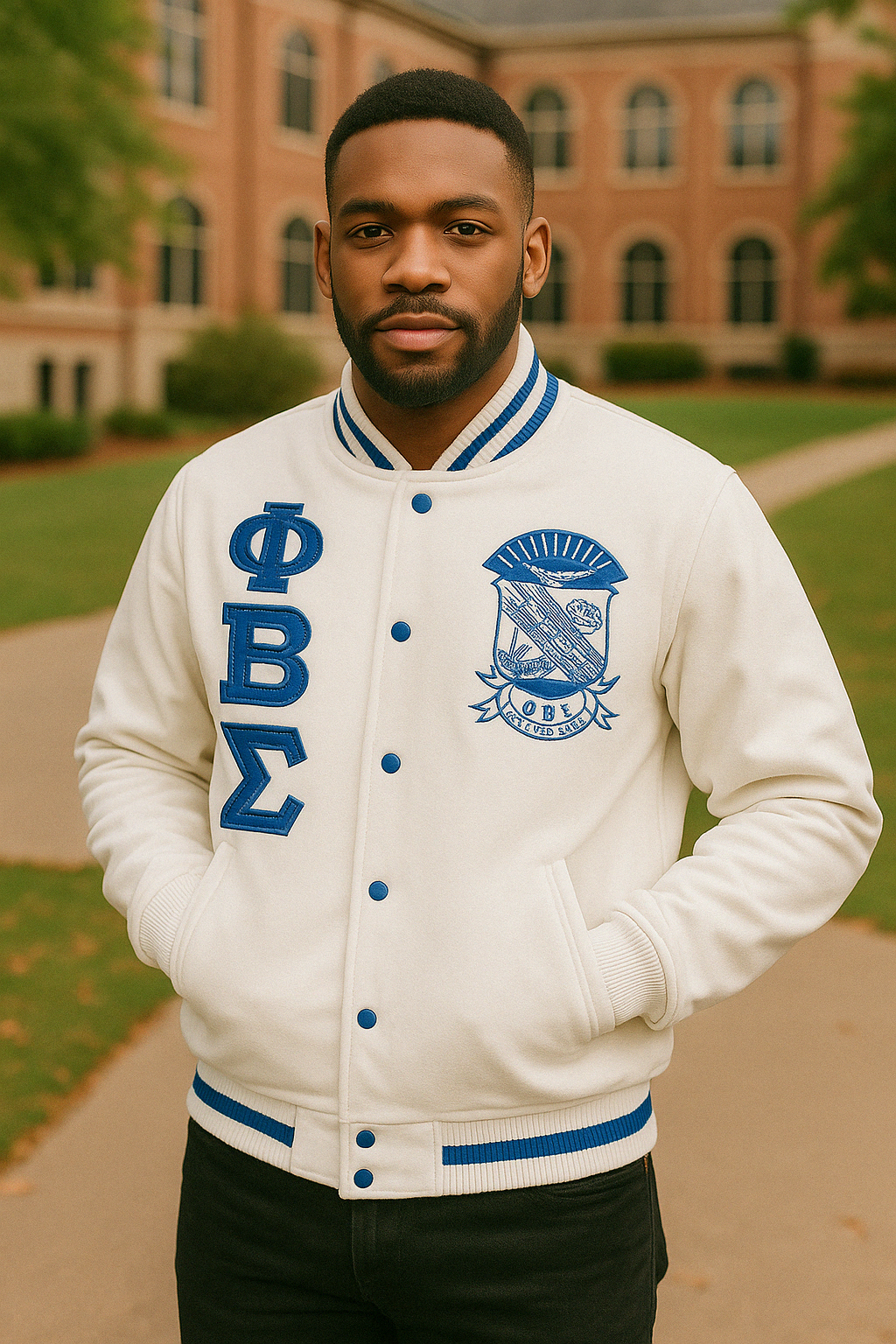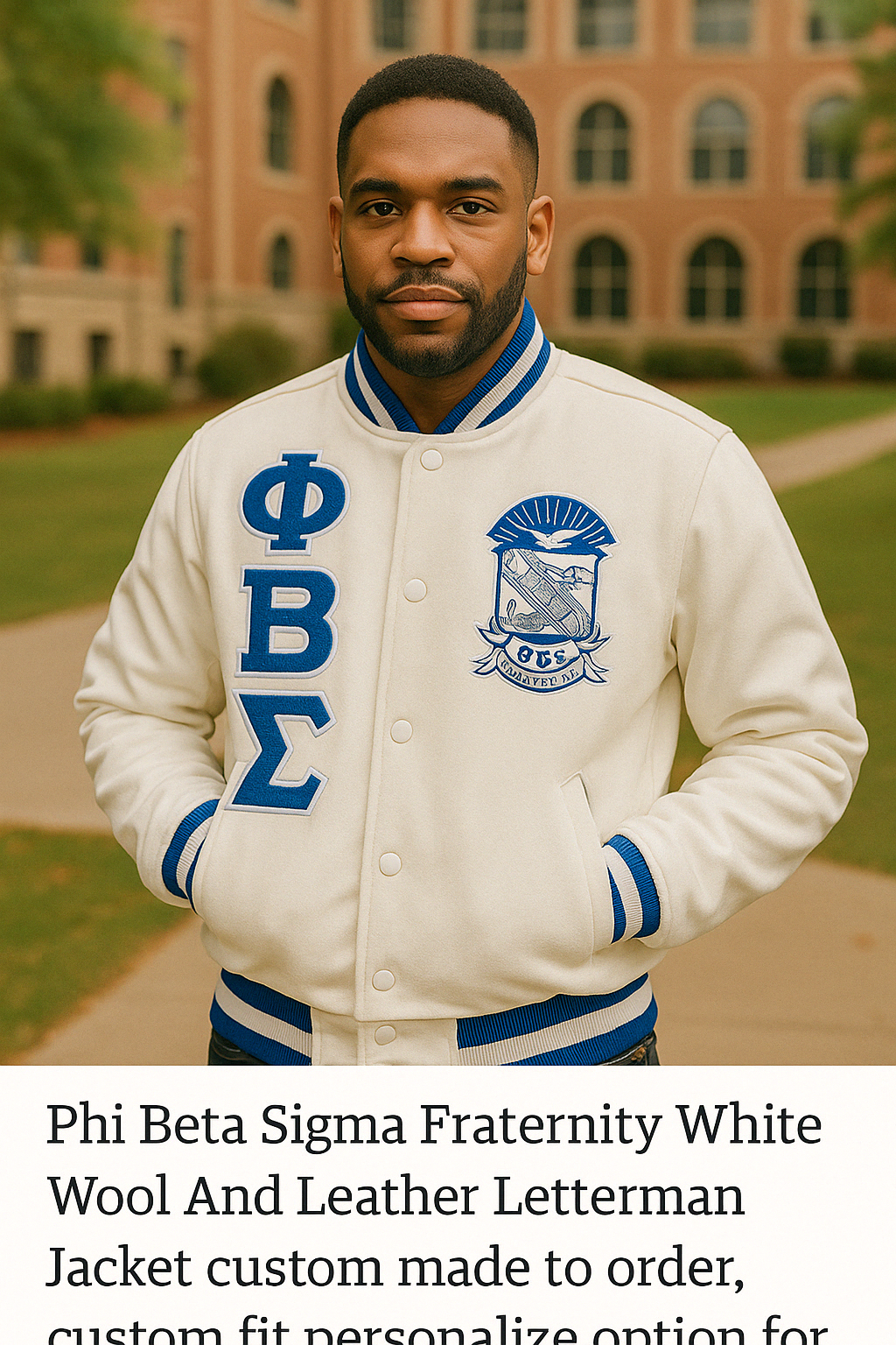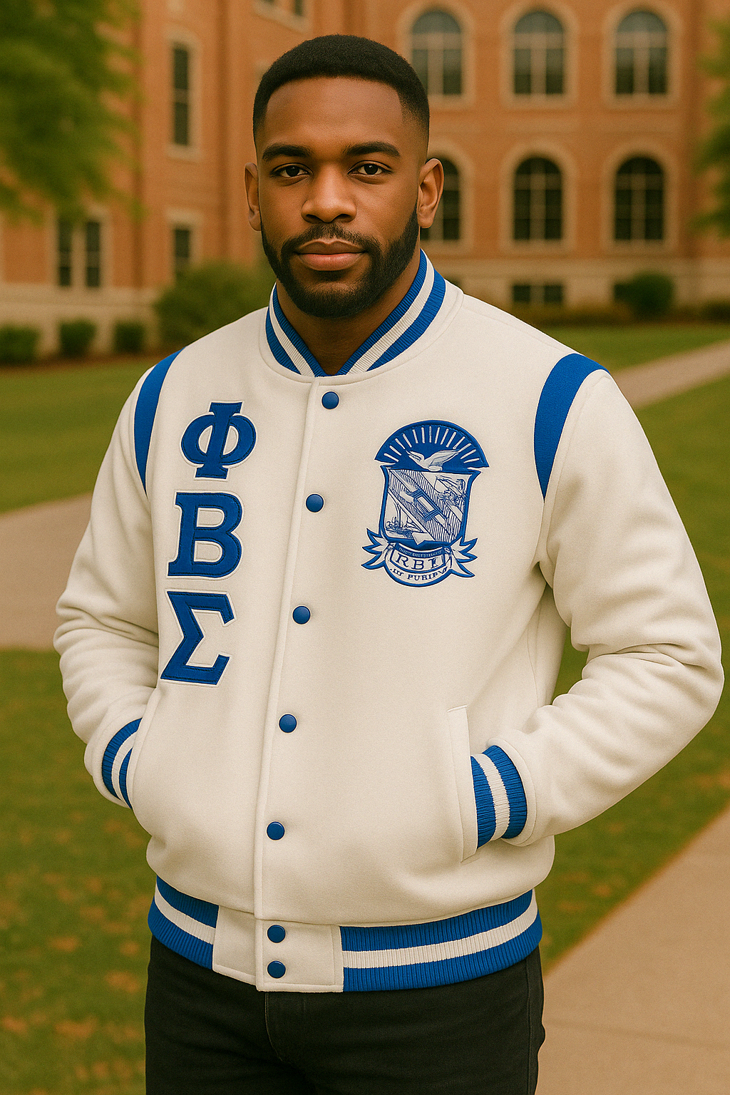 Honor the brotherhood of Phi Beta Sigma Fraternity, Inc. with this fully custom-made varsity letterman jacket, crafted in premium white wool with optional white or royal blue leather sleeves. Designed for PBS brothers, this jacket is made to order and fully personalized with your name, crossing year, line number, chapter, founding symbols, and Greek letters.