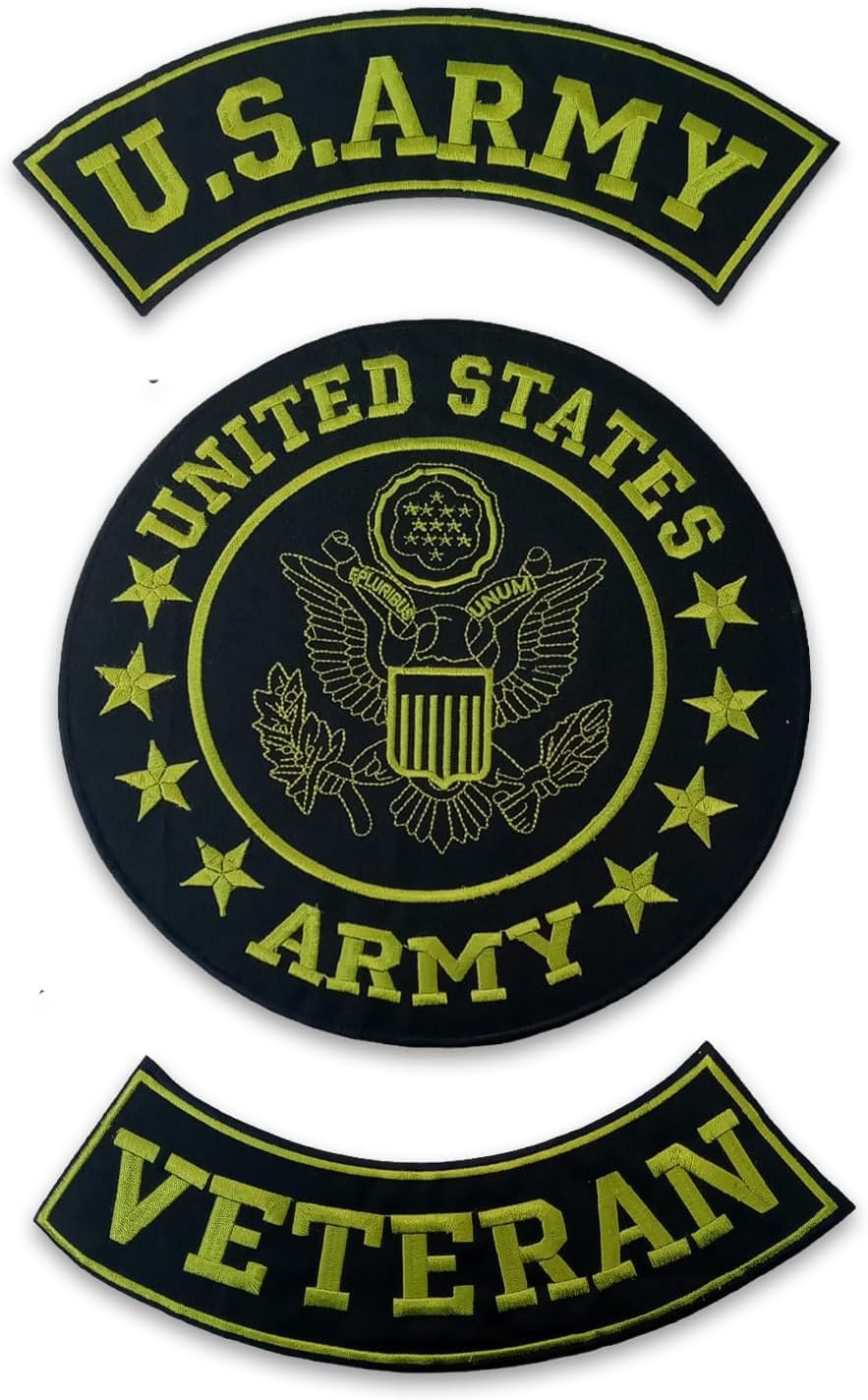 US Army Veteran 3-Piece Large Back Patch Set – Embroidered Military Biker Patches Iron On Sew On