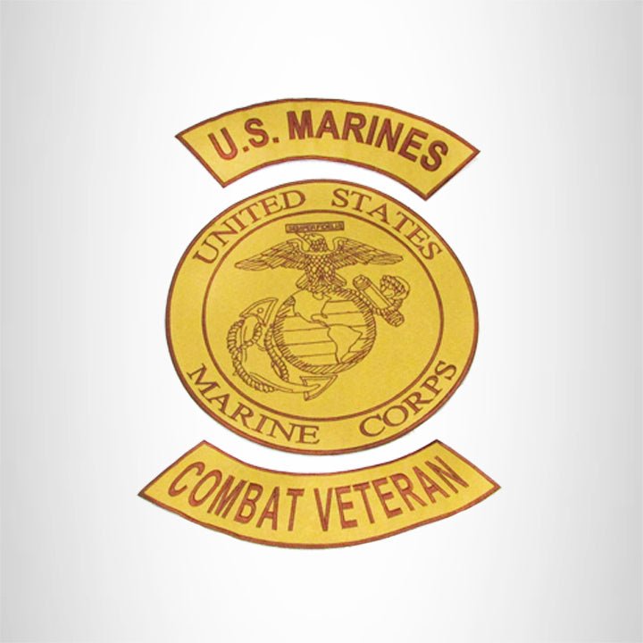 MARINES COMBAT VETERAN Brown on Gold Iron on 3 Large Back Patches Set for Biker Vest Jacket.