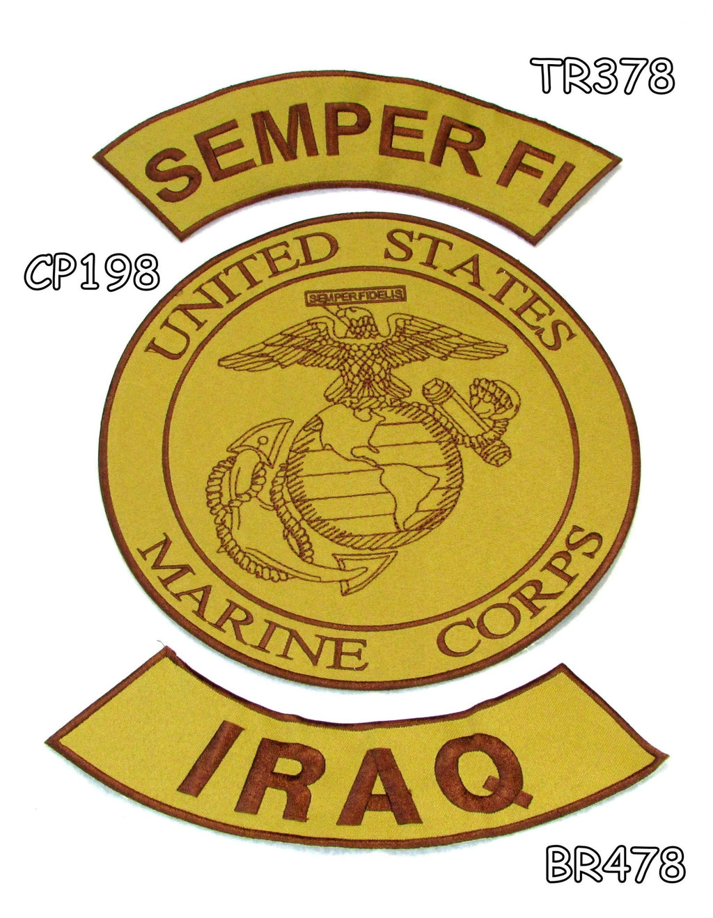 Semper Fi Iraq Iron on Sew on Patches Set for Biker Jacket Vest Size TR 12 x 3 inch, CP 10 inch Round, BR 12 x 3 inch. Iron on patch for jacket, vest, or shirt.