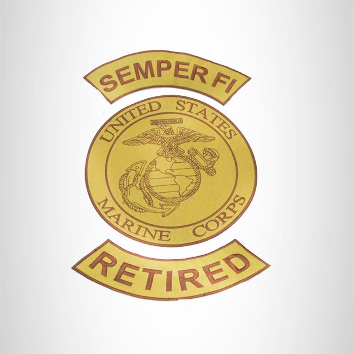 SEMPER FI RETIRED Brown on Gold Iron on 3 Large Back Patches Set for Biker Vest Jacket