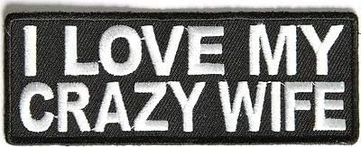 I LOVE MY CRAZY WIFE White on Black Iron On Sew On Small Patch for Jacket Vest